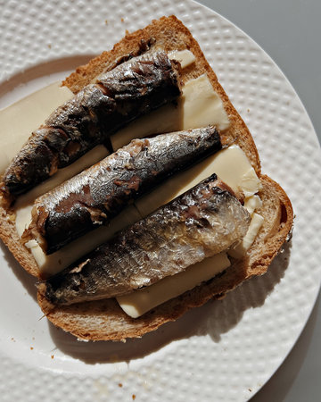 Open-faced simple sandwich made of toast bread, butter and sardines served on white textured plate