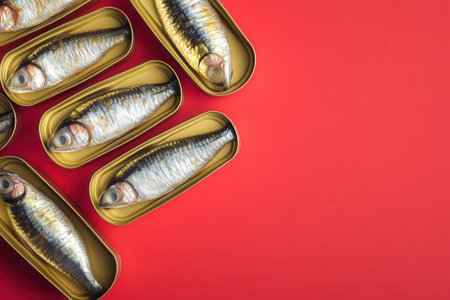 Canned sardines lying on red background, creating pattern