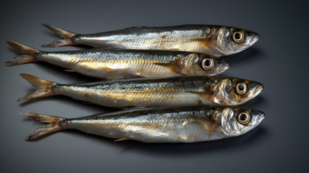 Still life sardines on dark rustic background in natural light, top view