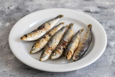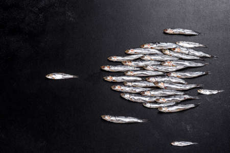 Several fish salted anchovies on a dark concrete table. Concept of small fish