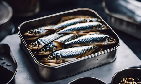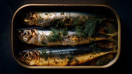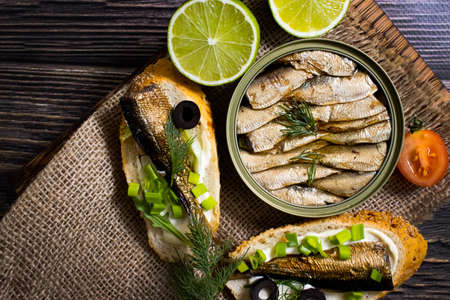 Canned sardines. Sea fish in tin can on black table.
