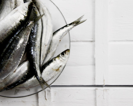 Group of sardines in the corner of wooden table