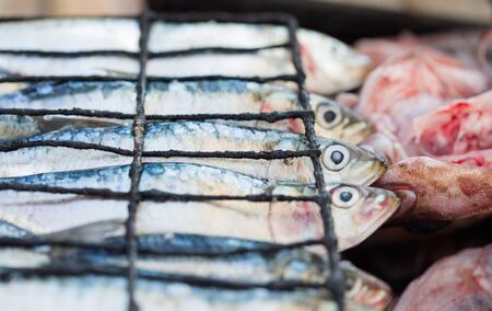Fresh pilchard prepared for grill on fish market in Essaouira, Morocco