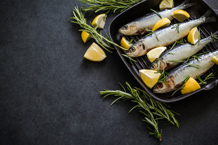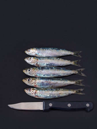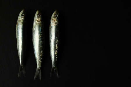 Fresh fish. Sardines on dark background with copy space. Directly above.