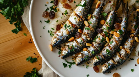 Discover a vibrant dish of marinated sardines in saor, featuring grilled fish with aromatic herbs, pine nuts, and raisins for a delightful Italian flavor.