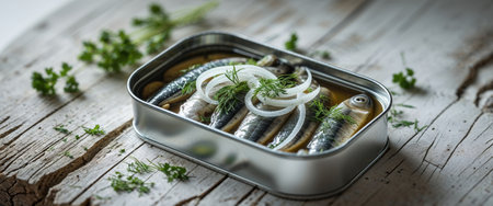 AI Generated. Tin of pickled herring with onion slices and herbs on wooden surface