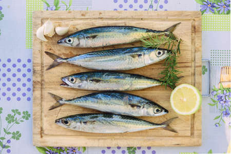 Raw mackerel with claws of garlic and lemon on wooden plate. Fresh fish