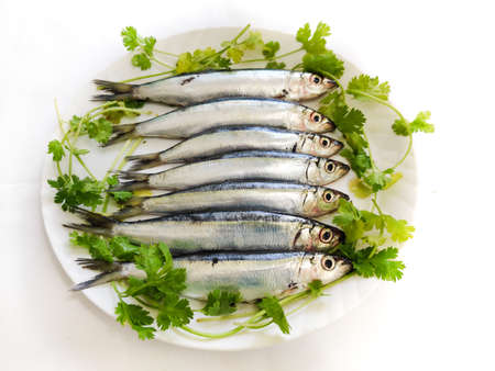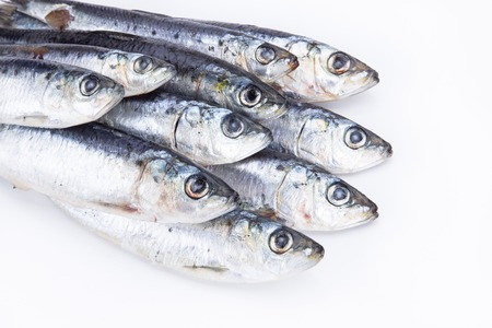 Fresh raw sardines on white background