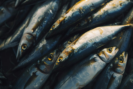 macro of fresh sardines stacked with shiny fish scales and glassy eyes