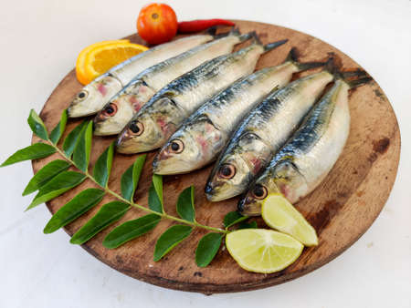Close up view of Fresh Indian oil sardine on a wooden pad,Decorated with herbs and Vegetables.White Background.