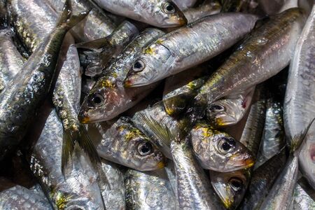 Fresh Colorful Portuguese sardines on ice exposition at the fish market. Close up.