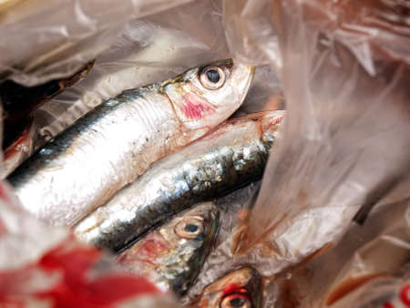 Closeup view of fresh Sardines in a plastic bag.