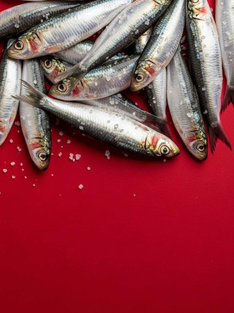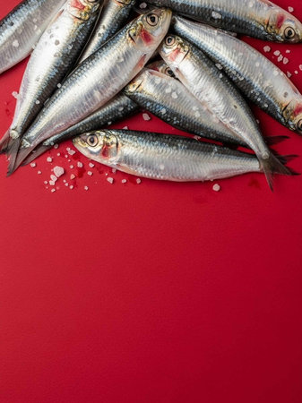 Fresh sardines on red background. Top view with copy space