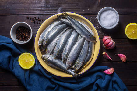 Fresh sardines on rustic wooden background.