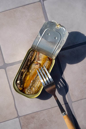 Open tin with sardines and fork. Seafood for quick meal. Healthy food ingredients for breakfast or light lunch.
