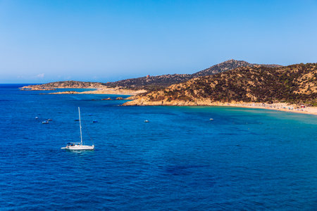 Panoramic view of sandy beach and sea with azure water, in Villasimius, Sardinia (Sardegna) island, Italy. Holidays, the best beaches in Sardinia. Porto Giunco beach, Villasimius, Sardinia.