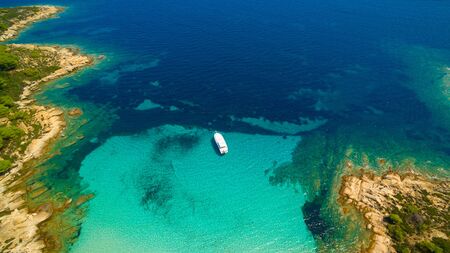 aerial photography, beautiful coast with beach, boat and mediterranean sea
