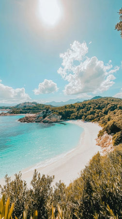A peaceful beach reveals crystal-clear turquoise waters surrounded by lush green hills and vibrant clouds. The sun shines brightly, enhancing the tropical atmosphere.