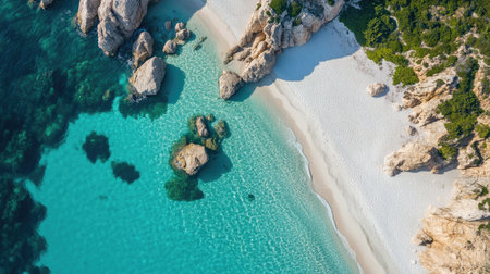 Experience the stunning beauty of a tranquil beach from above, featuring crystal-clear turquoise water and charming rocky formations along the coastline, perfect for relaxation.