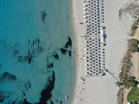 Aerial view of Vourvourou beach, small peninsula in turquoise water of Aegean sea. Waves beating cliff rocky coastline. Halkidiki, Greece.