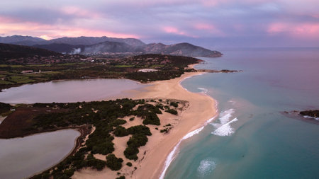 Beautiful aerial drone view of Sardinian coast during sunset. Travel destination.