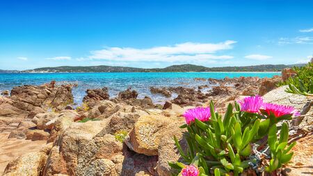 Fantastic azure water with rocks and lots of flowers at Doctors beach (Spiaggia del Dottore) near Porto Istana. Location: Porto Istana, Olbia Tempio province, Sardinia, Italy, Europe