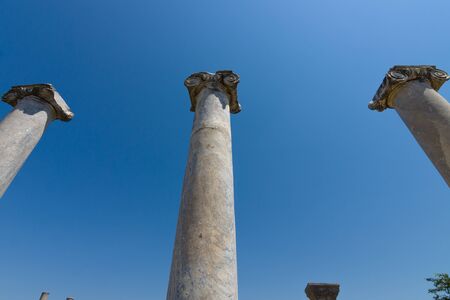 A beautiful shot of columns and ruins with a clear blue sky in the background in turkey