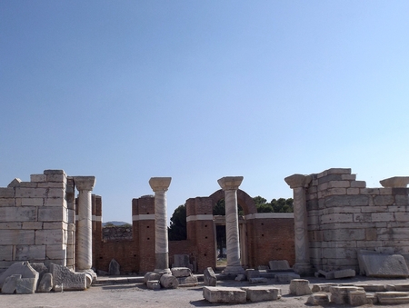 Sardis ancient city which has gymnasium and synagogue ruins and columns in Manisa