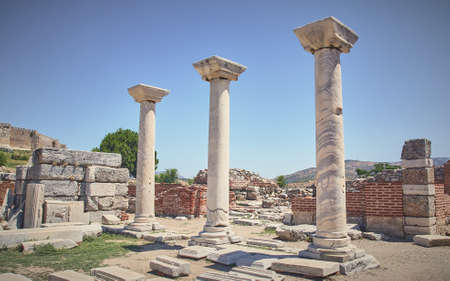 Ruins and columns of St. Johns Basilica at Ayasuluk Hill, Selcuk Ephesus, Izmir, Turkey.