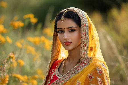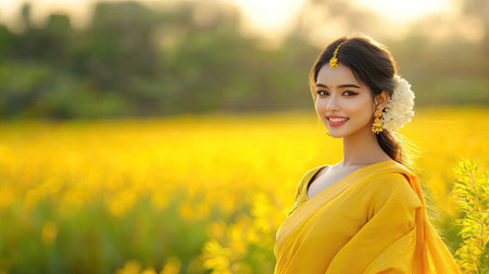 A stunning woman wearing a bright yellow saree and smiling in a vibrant field of flowers. The warm sunlight captures her beauty and grace.