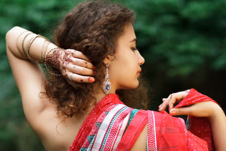 Portrait of Indian girl in sari with pattern of henna on hands. Green trees background.