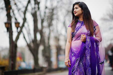 Indian hindu girl at traditional violet saree posed at street.