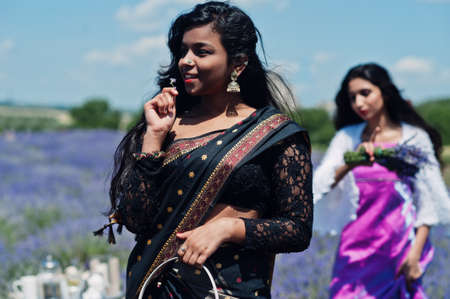 Two beautiful indian girsl wear saree india traditional dress in purple lavender field.