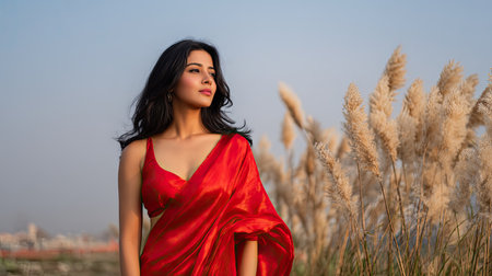 A young woman gracefully wears a red saree, standing confidently in a field of tall grass under a vibrant sky during sunset, radiating beauty and elegance.