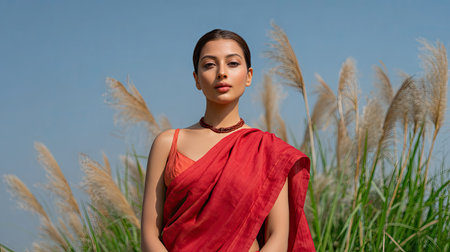 A graceful woman stands confidently in a vibrant red saree among tall grasses, showcasing traditional elegance against a picturesque blue sky backdrop.