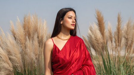 A graceful woman draped in flowing red attire stands amidst soft pampas grass. The clear blue sky enhances the serene atmosphere, capturing beauty and elegance.