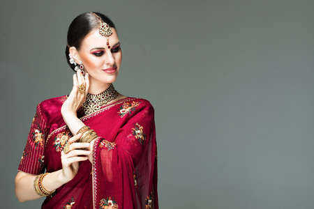 beautiful indian girl over grey background. Young hindu woman model with jewelry set .