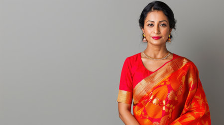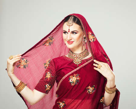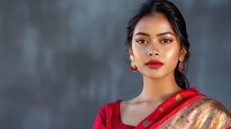 Portrait of a smiling beautiful Indian woman wearing red saree. Copy space.