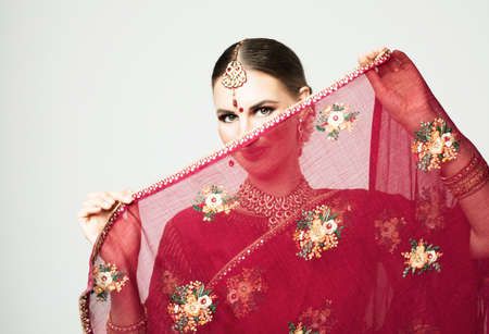 Young woman in Indian red sari with traditional jewelry.