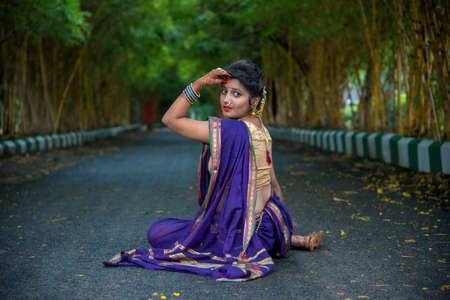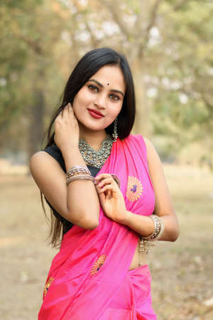 Indian Traditional Beautiful young girl in saree posing outdoors