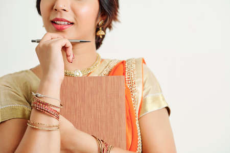 Cropped image of smiling intelligent Indian woman in sari holding pen and planner