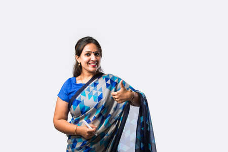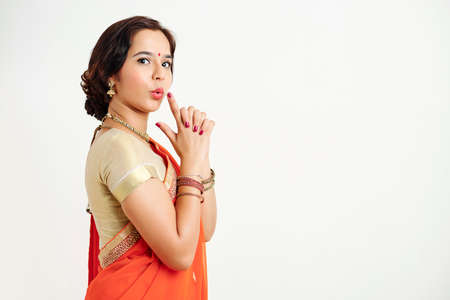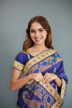 Portrait of happy dressed young Indian woman in traditional sari dress