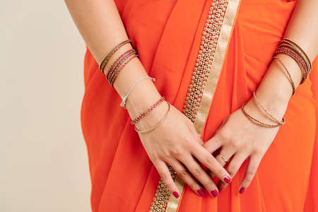 Manicured hands of young Indian woman wearing many beautiful golden bracelents and bright embroideren sari dress