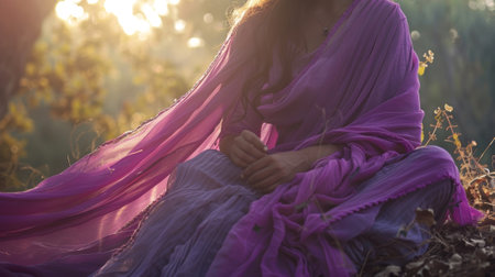 A woman sitting in a peaceful outdoor space wrapped in a flowing purple shawl that catches the light and flutters softly in the breeze