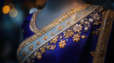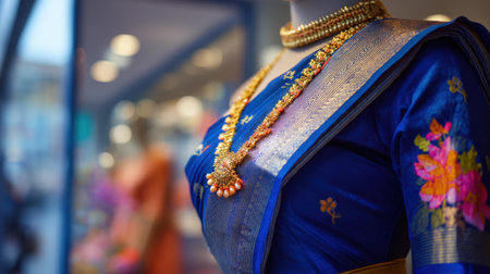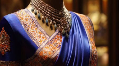 A captivating display of traditional attire showcasing rich blue fabric with delicate embroidery and elegant gold jewelry accents, embodying cultural beauty.