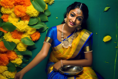 Happy Onam. Holiday for South India festival. for greeting card, banner, poster, title, emblem, label, tag. ancient Hindu festival of Kerala. Malayalis Harvest Sadya, Thiruvathira Kali. Generative AI.
