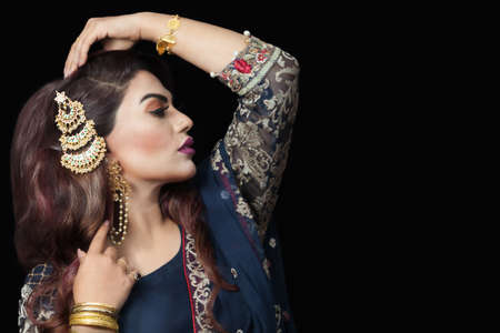 Portrait of beautiful young woman with black and blue traditional India costume.