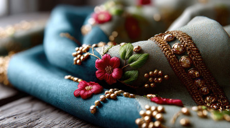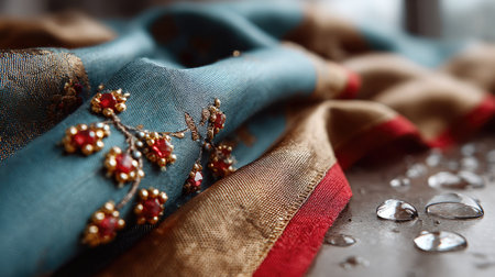 This close-up image features a luxurious fabric adorned with exquisite embroidery and shimmering beads, reflecting elegance and artistry. Water droplets enhance the visual appeal.