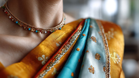 This close-up showcases the intricate details of a traditional Indian saree, featuring vibrant colors and exquisite jewelry, perfect for cultural celebrations.