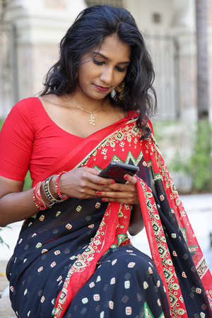 Young attractive beautiful Indian woman in red and black saree texting reading massage smartphone outdoors urban brick wall background
